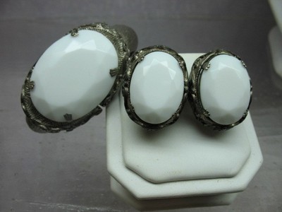 Title (ebay affiliate link): Vintage Silver Tone Faceted Chunky Milkglass White Cab Bracelet Earring Set