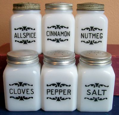Title (ebay affiliate link): 6 vtg "DOVE" BRAND MILK GLASS SPICE JARS "FRANKS TEA" SALT & PEPPER SHAKERS