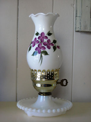 Title (ebay affiliate link): VINTAGE WHITE MILK GLASS HURRICANE TABLE LAMP WITH PAINTED FLOWER PATTERN