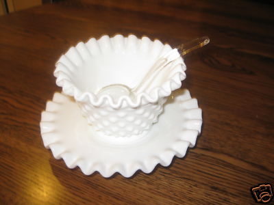Title (ebay affiliate link): 3 PC Fenton Hobnail Milk Glass Compote/Gravy Bowl on Dish with clear spoon