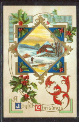 Old Antique Vintage 1910s Emb CHRISTMAS Postcard SILK PIECE COUNTRY SCENE !