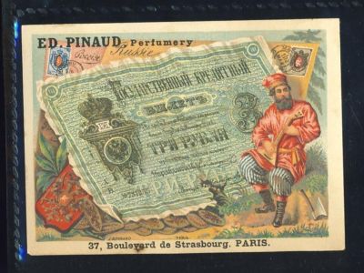 Title (ebay affiliate link): TC138, Ed. Pinaud Perfumery, Paris, russian? currency, Victoran trade card