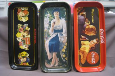 Title (ebay affiliate link): 3 Coca Cola Reproduction Metal Trays Welcome Women Holding Coke Lady w/ Pansies