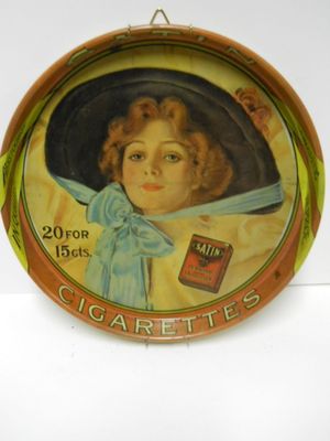 Title (ebay affiliate link): ViNtAgE Tin Tray TOBBACO SATIN Lady in bonnet chic shabby serving Advertising NR