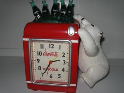 Title (ebay affiliate link): Polar bear hugging the side of a ice chest, coca-cola alarm clock and bank.