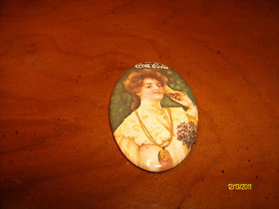 Title (ebay affiliate link): Coke Cola Pin with Lady drinking Coke from Glass 2" by 2 3/4" - no wire on back
