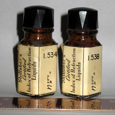 Title (ebay affiliate link): 2 Vintage Bottles Shillaber's Certified Refractive Index Liquids: 1.534 & 1.538