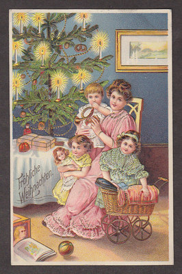 Title (ebay affiliate link): X2035 Embossed Christmas postcard, Mother and Children, Tree, Used 1909,