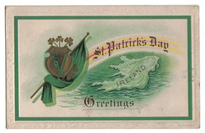 Title (ebay affiliate link): Flag~Harp~Gold Shamrocks & Shield~St Patrick's Day~Postcard 1907+
