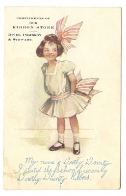 Title (ebay affiliate link): VINTAGE ADVERTISMENT POSTCARD DOROTHY DAINTY GIRL RIBBONS STORE LITTLE GIRL BOW