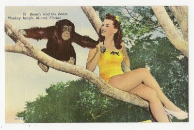 Title (ebay affiliate link): VINTAGE LINEN RISQUE POSTCARD PRETTY LADY BATHING SUIT CHIMPANZEE MONKEY JUNGLE