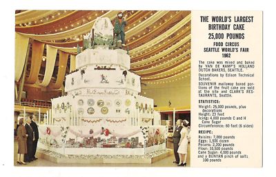 Title (ebay affiliate link): 1962 Seattle, WA World's Fair Unused Poscard-25,000 Lb Cake(World's Largest)-VF
