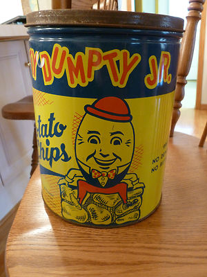 Title (ebay affiliate link): Vintage Humpty Dumpty Jr Potato Chip Tin 1lb or over Tin 10.5" high;8.5"diameter