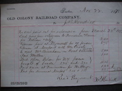OLD COLONY RAILROAD BOSTON 1878 RECEIPT TO J. R. KENDRICK