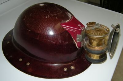 McDonald fiberglass leather MINING HELMET with AutoLite brass lantern NR