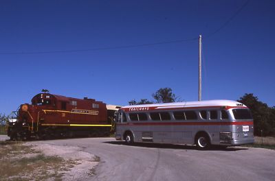 Arkansas & Missouri RS32 # 30 on SARM charter meets 1960Trailways bus Sept 2010