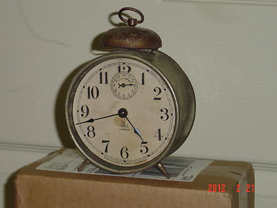 Antique WATERBURY CALL Peg Leg Top Bell Alarm Clock, Nickel Case, working !!