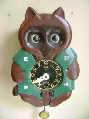 Title (ebay affiliate link): ANIMATED NOVELTY MI-KEN RACCOON OWL MOVING EYE WOODEN WALL CLOCK