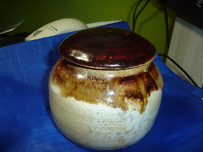 Title (ebay affiliate link): Pottery Crock Jar Lidded Unusual & Unique Mushroom Lid,Gorgeous Piece