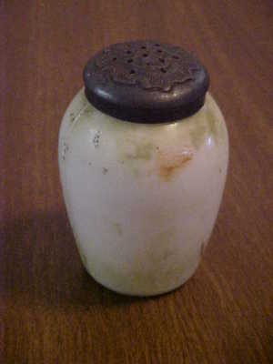 EAPG Milk OPAQUE Glass SHAKER w Fancy FIGURAL TOP Metal