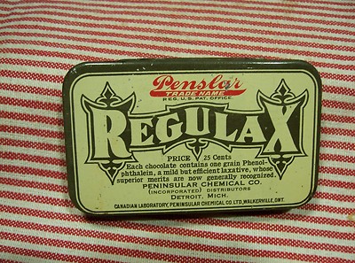 Title (ebay affiliate link): Laxative Tin-Regulax-Penslar-Chocolate Flavor-Detroit-Walkerville,Ont.-NR