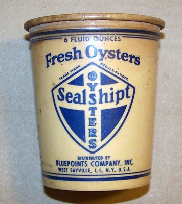 Title (ebay affiliate link): Old 6 Oz.Sealshipt Oysters-Bluepoints Co.W.Sayville,L.I.,NY-Waxed Container