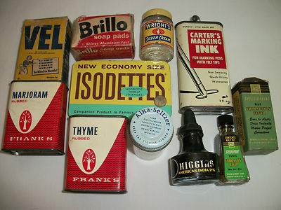 Title (ebay affiliate link): VTG Lot of 10 Tins Bottles Soap Ink Tin Carters Lead Spout Spice Etc.