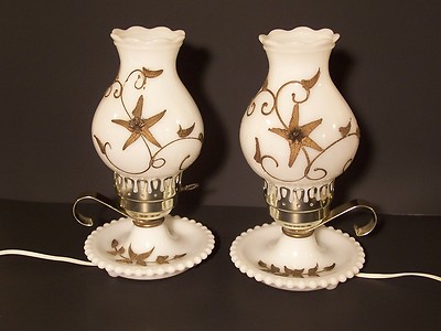 Title (ebay affiliate link): VINTAGE MILK GLASS AlLADDIN STYLE LAMPS WITH HOBNAIL BASE GOLD COLOR LEAF TRIM