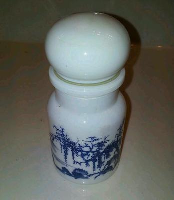 Title (ebay affiliate link): Vintage Made in Belgium Milk Glass Apothecary type Jar Blue on White