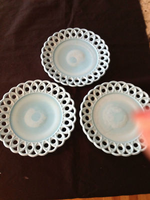 3 BLUE MILK GLASS PLATES WITH OPEN LACE EDGE