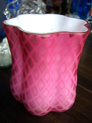 Title (ebay affiliate link): CASED MILK GLASS SATIN PINK DIAMOND PATTERN VASE DRESSER FLOWER HAND BLOWN VTG