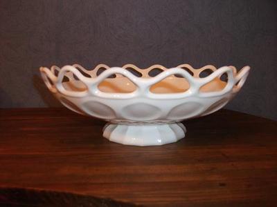 Title (ebay affiliate link): Vtg. Imperial Open Lace Pedestal Center Bowl Milk Glass with beautiful designs