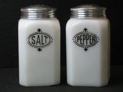 Title (ebay affiliate link): Milk Glass Hazel Atlas Salt and Pepper Range Shaker Black Shield Lettering