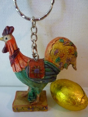 Title (ebay affiliate link): ANTIQUE LOOKING VERY COLOURFUL ROOSTER KEYRING PLUS A FREE EASTER EGG BN