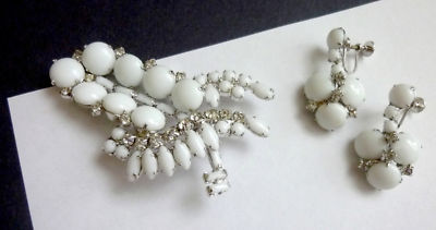Title (ebay affiliate link): VINTAGE CONTINENTAL MILK GLASS & CLEAR RHINESTONES CHUNKY BROOCH & EARRINGS
