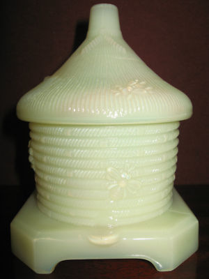 Yellow Vaseline milk glass serving honey pot bee hive pattern jar canary uranium