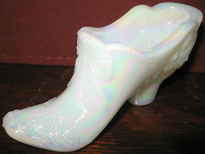 Title (ebay affiliate link): White Milk carnival glass Bow pattern Shoe Slipper Boot iridescent christmas art