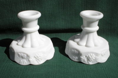 Title (ebay affiliate link): PAIR OF MILK GLASS PANELED GRAPE CANDLEHOLDERS BY WESTMORELAND GLASS