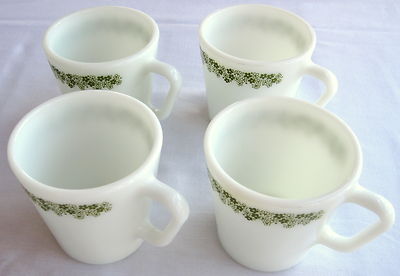 Title (ebay affiliate link): PYREX Lot of 4 Vintage SPRING BLOSSOM DAISY D Handle Milk Glass Mugs 1410 MINT