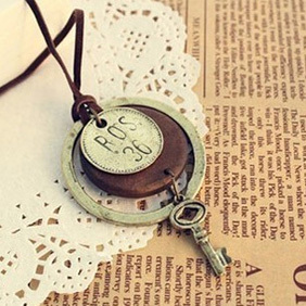 Vintage Faux Leather Rope Ring Wooden Key Chain Necklace 6166