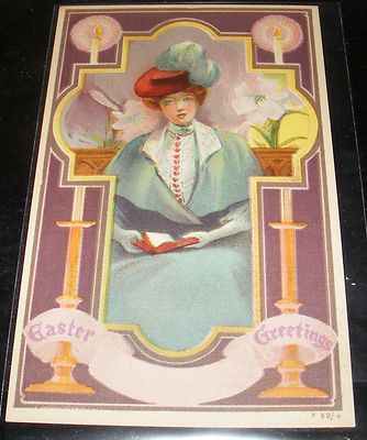 Beautiful Woman In Early 1900s Dress Hat^Easter Lilly Flowers Easter Postcard
