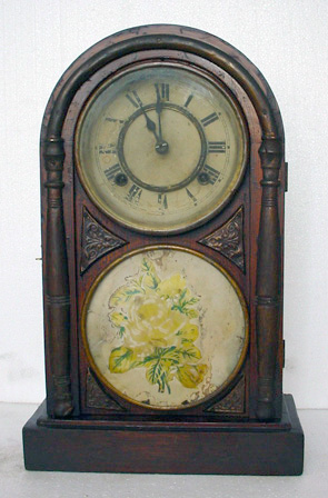 Title (ebay affiliate link): ANTIQUE ROUND TOP FLORAL PANEL COLUMN TRIM MANTLE CLOCK