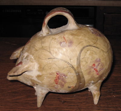 Title (ebay affiliate link): VINTAGE ANTIQUE FOLK ART POTTERY PIG PIGGY BANK OLD PAINT DECORATION