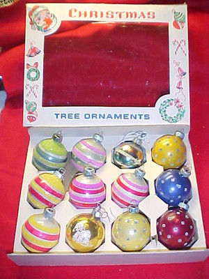 12 VTG SHINY BRITE XMAS TREE ORNAMENTS MICA POLKA DOT STRIPED STENCILED RARE