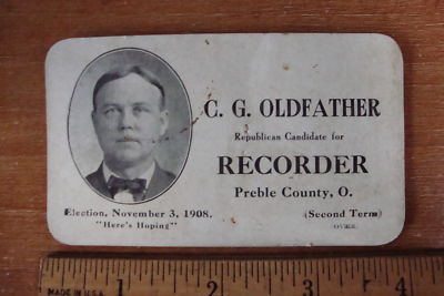 Title (ebay affiliate link): Antique Political Advertsing Card Preble COUNTY Recorder 1908. C.G. Oldfather
