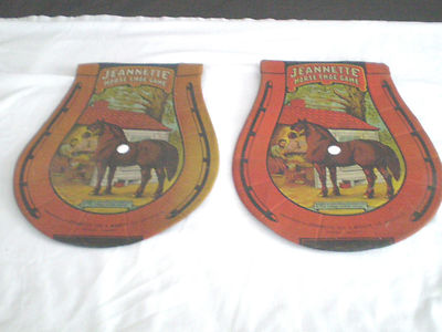 Title (ebay affiliate link): Antique JEANNETTE Horseshoe Game -Great Lithographed Graphics on Tin Bases