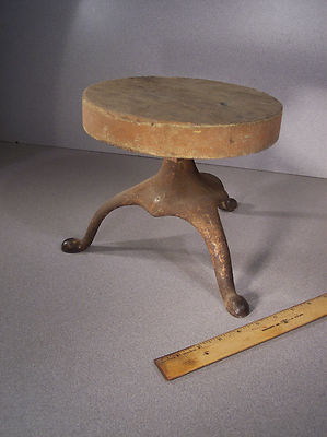 Title (ebay affiliate link): Small antique wood and metal foot stool 10" Dia at foot 9" Tall