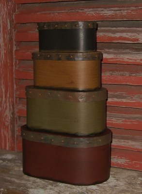 Title (ebay affiliate link): FOUR Primitive Stacking Banded Pantry BOXES-Country Cupboard/Shelf/Table Decor