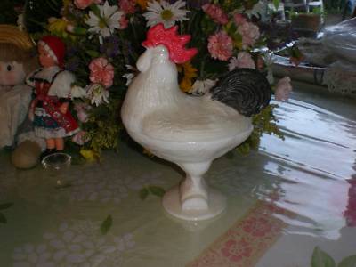 10" TALL MILK GLASS ROOSTER CANDY DISH