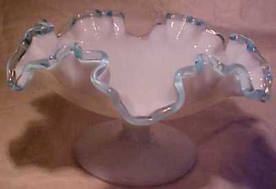 FENTON MILK GLASS LOW CANDY COMPOTE W/ AQUA BLUE CREST